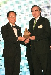 Donald Tsang (left), Chief Executive of HKSAR, presents the award to HIT Managing Director Eric Ip [12 May 2010 – Hong Kong] Hongkong International Terminals Limited (HIT) received today a Transport and Logistics Gold Award under the Sectoral Awards of the Hong Kong Awards for Environmental Excellence (HKAEE) programme organised by the Environmental Campaign Committee. The HKAEE programme aims to encourage businesses and organisations to adopt green management practices and to present them with an opportunity to benchmark their commitment towards environmental excellence. The award indicates HIT’s outstanding performance in the areas of "Green Leadership", "Programme and Performance", and "Partner Synergy", the three assessment criteria of the HKAEE programme. Eric Ip, Managing Director of HIT, accepted the award on behalf of the company at a ceremony officiated by Donald Tsang, Chief Executive of the Hong Kong Special Administrative Region, and Edward Yau, Secretary for the Environment. Upon accepting the award, Mr. Ip said, "Since we received the Silver Award last year, which highlighted our development of electric rubber tyred gantry cranes (eRTGCs), we have invested greatly in the development of the hybrid RTGCs, which combine battery power with ultra-low-sulphur diesel engines. We are pleased that our efforts to reduce our impact on the environment and conserve resources are once again being recognised." He further added, "We have gone beyond statutory requirements with several of our green initiatives and we are constantly looking for ways to enhance our operations to reduce our environmental footprint." HIT is the first container terminal in Hong Kong to develop eRTGCs and hybrid RTGCs. At the moment, 35 eRTGCs and 24 hybrid RTGCs are in operation. Twelve more eRTGCs will be added this year. HIT aims to have around 80 eRTGCs and over 50 hybrid RTGC by the end of 2011. eRTGCs reduce carbon dioxide emissions at the port substantially by drawing power from the electrical grid. Meanwhile, hybrid RTGCs feature smaller engines supplemented by battery power to reduce diesel fuel consumption per crane by over 50 percent and lower carbon dioxide emissions by an equal amount. Additionally, hybrid RTGCs recycle energy when the main hoist is being lowered.